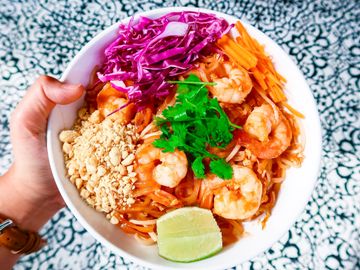 Pad Thai is the national noodle dish of Thailand: sold on every street. Recommended with our jumbo prawns, these Thai rice noodles are pan-fried with egg, spring onion, bean sprouts, peanuts and your choice of meat. Recommend to squeeze lime wedge. This dish is not spicy. If you'd like to add spicy, please indicate level 1-5 spicy. Choice of meat Chicken, Tofu or add Shrimp $5 more